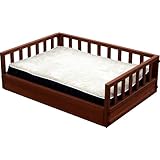 This was way more than I expected for the price. It is plastic but looks like wood and honestly is your dog going to know? No. I wish it was bigger because it says "large" but it is absolutely NOT for a large breed dog. My dog is a beagle and she just fits on it curled up to lay down, if she wanted to sprawl out she could not have much room to do so. So anything much bigger than a beagle is not going to fit! It would be nice if the bed frame stood higher off the ground. The picture makes it look as if it does and it is not really "raised" so I plan to have my boyfriend create a better bottom for it. The cushion is nice but it really is not much, I surely would not sleep on it! So I lined mine with a furry comfortable blanket for the dog to have a bit more comfort. I have not tried to clean it as I have not had it long. The dog does not really like it but thats because she is spoiled and wants to sleep in my bed (which I can not sleep with her in it because for a small dog she sure takes up some room-whole point in buying the bed) She is getting the hang of this being her bed though. I also bought her a large comforter to keep warm in because she loves to be under and engulfed in blanket! She falls right asleep once I force her onto it lol so if you have a small or medium sized dog this will work wonders and is worth what you pay. I have paid a lot for just a stupid pillow on the floor before and as she is my baby I do not see how I could make her sleep on that! So this is cute. It gives your dog the feel of their own "real bed" and makes me feel better knowing she is not just on some flimsy pillow. The item says its cleanable and just to take the outer case off of the matrress and you can machine wash. Once I try it, if I have problems I will be sure to update!Best Deals for NewAgePet Indoor/Outdoor Raised Pet Bed, Large, Chestnut
