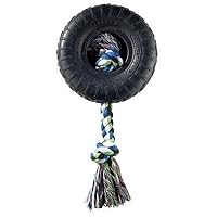 this cool rubber tire is bigger & heavier than i expected (that's a good thing). it's almost big enuff for a small wheelbarrow. lol. my 70 lb red nose pit bull, shogun, loves it as a tug toy, & believe me, he knows how to grip & tug. (he's a pit bull, for cryin' out loud) lots of teeth marks on it, but no signs of wear or shredding yet. it's a tough, solid toy & i think it's gonna last a while. highly recommended for a large dog who likes to chew. the braided rope that's attached won't last, so i suggest you cut it off & throw it away before it gets shredded, which in shogun's case, took less than 5 minutes. you don't need it anyway....the tire is big enuff to play tug without it, while keeping your fingers far away from those "jaws". when this one's gone, i'll get another one.