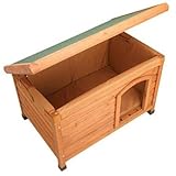 This doghouse is great. It is large enough to fit two dogs of about 40lbs when they ball up. My problem is my dogs are not trained to use dog houses, just their crates in doors so they are unsure of what to make of it. Hopefully soon they will enjoy laying in it to get out of the cold wind.Only con was some of the corners were chipped when I opend the boxes, but nothing that I would want to take the time to send back. Would purchase again if necessary.