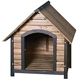 It's pretty hard to find a good deal on a large size dog house that matches the decor in your yard. This one hit the spot. It is all natural wood that looks and feels great. It comes in pieces in a box and all you have to do is screw them together. The screws have pre-drilled holes so you can't make mistakes. I gave this a four stars instead of five because the wood could have been a little thicker, and it could have had some water proofing/shingles for the roof. The floor is raised off the ground to keep your pet dry, but they don't mention that he legs are adjustable to keep the house level. Each leg has a plastic covered screw that allows you to adjust its height. Overall this is a great dog house for a large breed dog like a Yellow Lab.